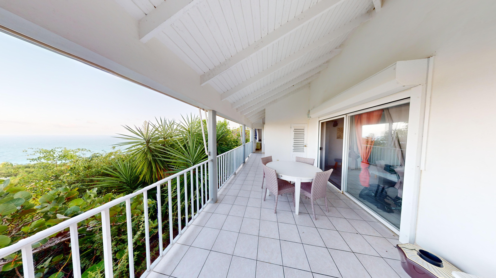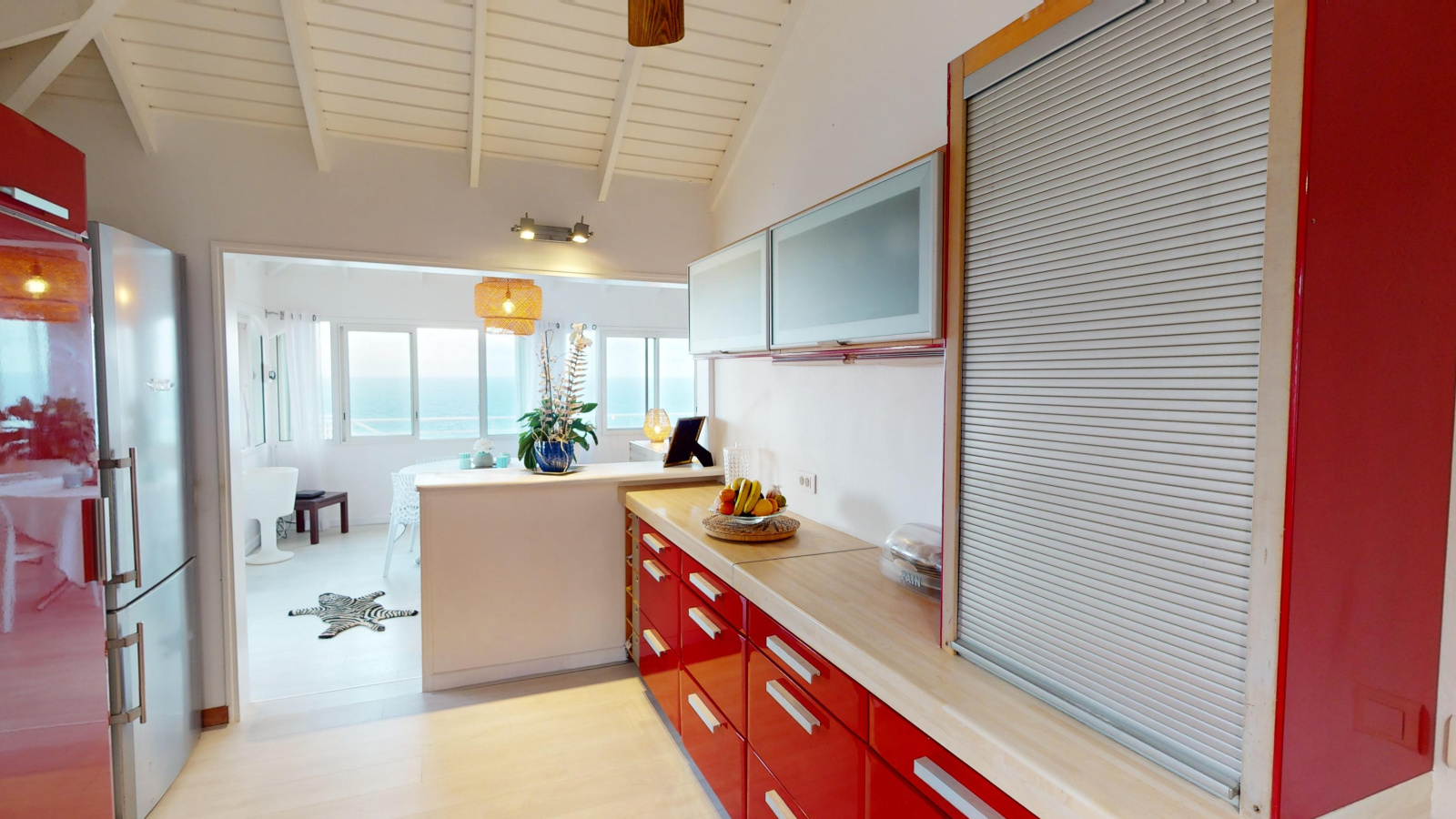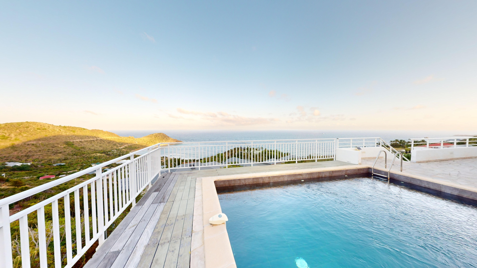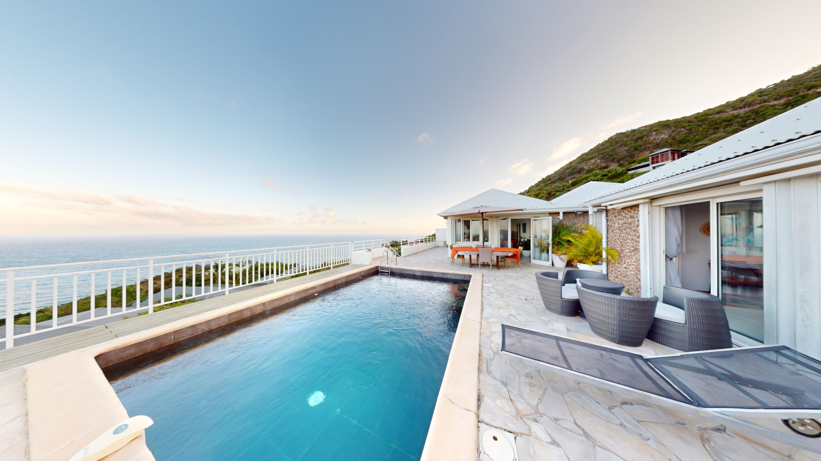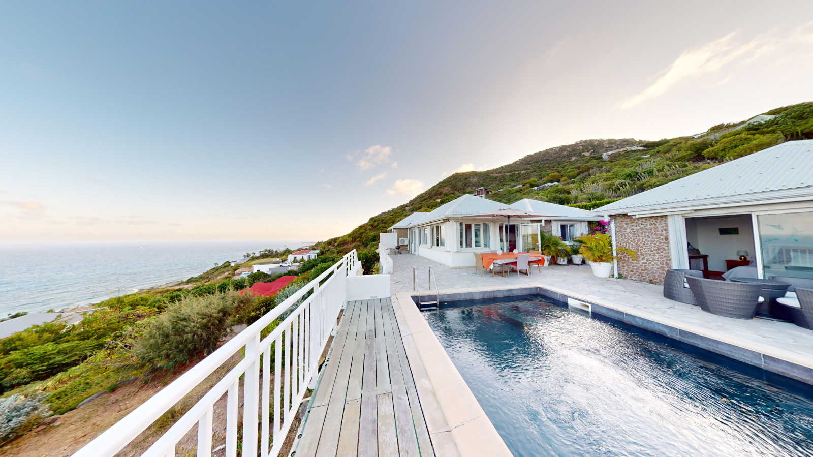 La première villa est composée d'un magnifique séjour faisant face à la mer, d'une cuisine ouverte, buanderie, 3 chambres, 3 salle de douche. Elle offre également une superbe terrasse avec piscine, toujours face à la mer.